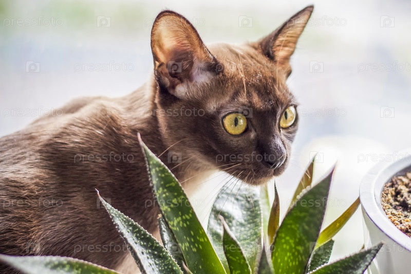 Крупный план бирманской кошки дома. Портрет молодой красивой коричневой кошки