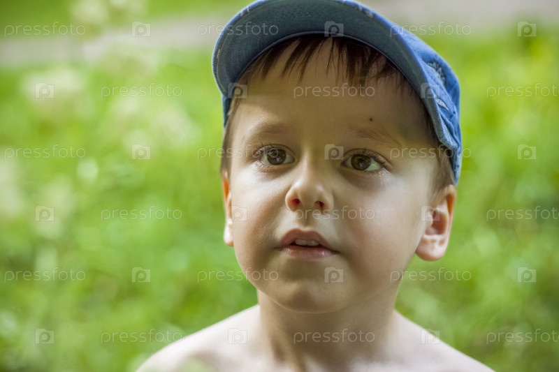 Симпатичный белокурый мальчик испытывает радость от прогулки летним днем у реки, сидя на сочной траве. Забавное выражение лица. летняя жара, ребенок без футболки