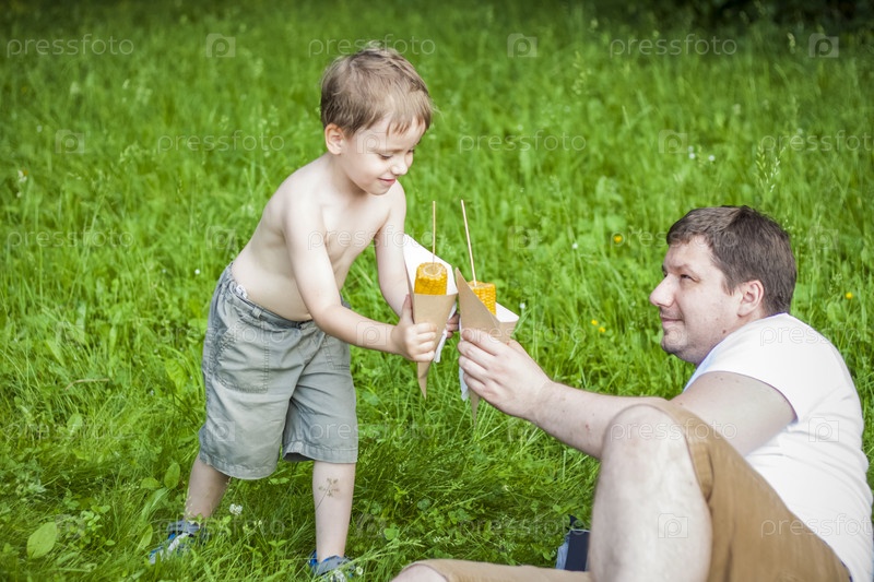 Симпатичный белокурый мальчик и его отец летом едят кукурузу, сидя на берегу реки на сочной траве. Забавное выражение лица
