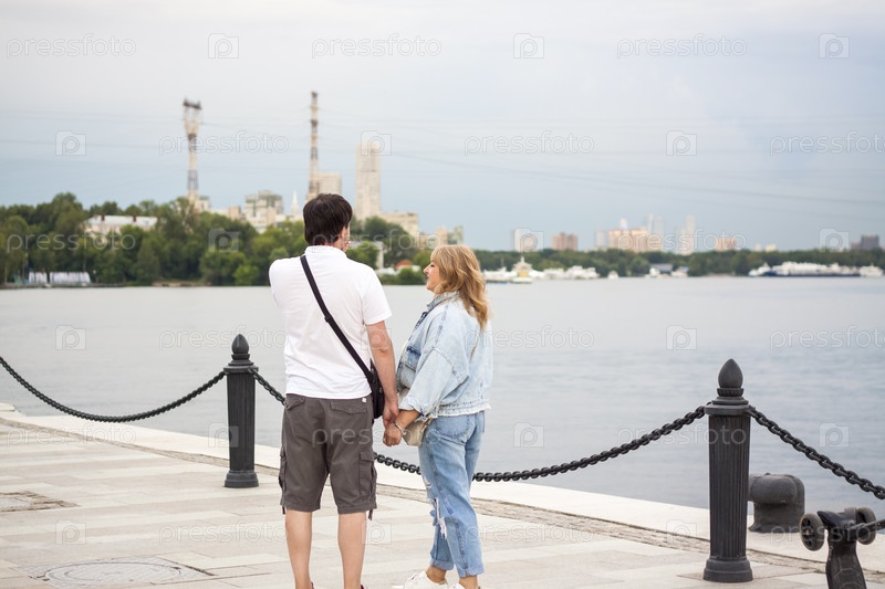 2022-07-17. Россия. Москва. Северный речной вокзал. Ходить. Молодая пара идет рука об руку по набережной в летний день