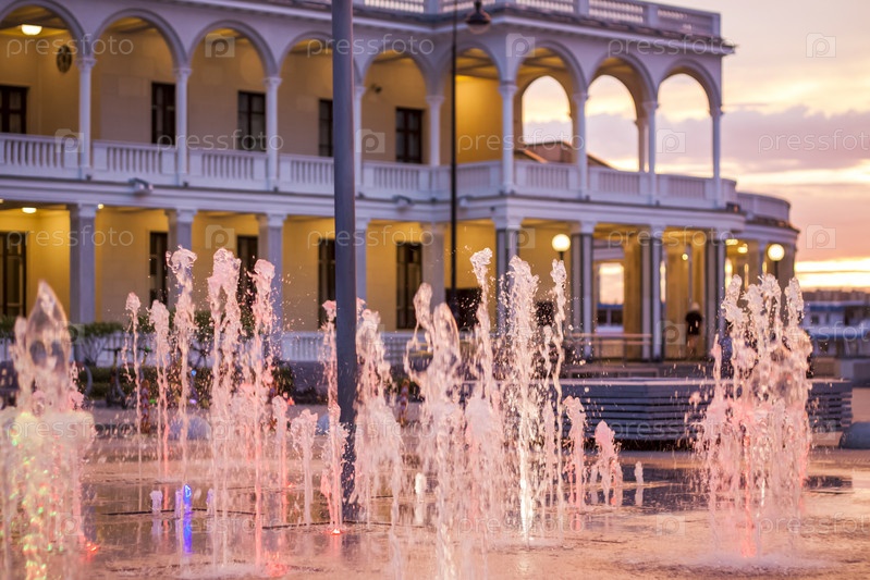Уличные фонтаны возле здания в парке в лучах заката. Вечерняя прогулка по городу