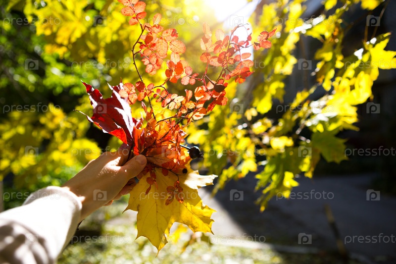 Осенний букет из желтых и красных сушеных листьев в руке - осеннее настроение, яркие цвета