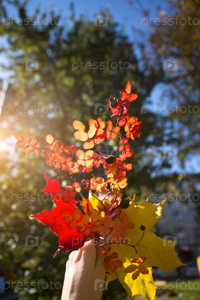Осенний букет из желтых и красных сушеных листьев в руке - осеннее настроение, яркие цвета