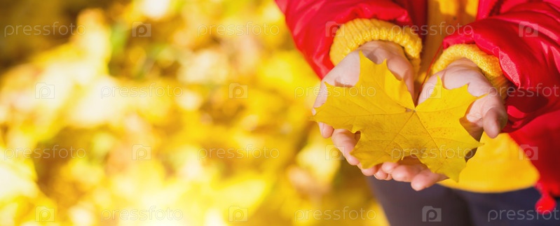 Сухой желтый кленовый лист в детских ладошках – осеннее настроение, смена времен года