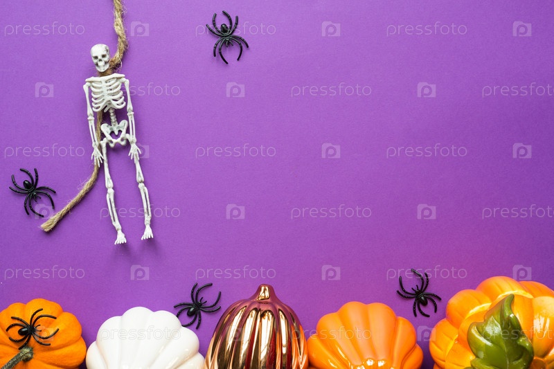 Хэллоуин макет гирлянды скелета на веревке, светящийся фонарь Джека, тыквы, пауки на фиолетовом фоне. Плоский лежал ужас и ужасный праздник