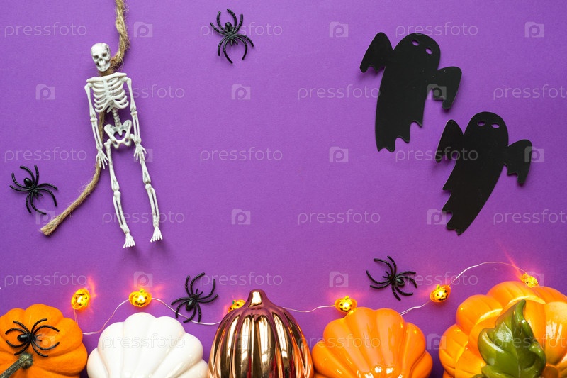 Хэллоуин макет гирлянды скелета на веревке, светящийся фонарь Джека, тыквы, пауки на фиолетовом фоне. Плоский лежал ужас и ужасный праздник