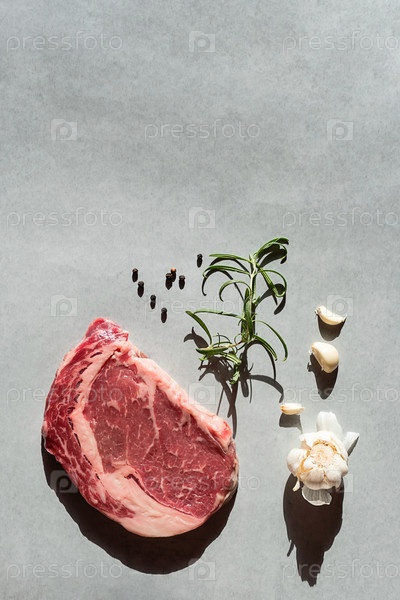 Сырой стейк рибай с розмарином, чесноком и перцем готов к приготовлению