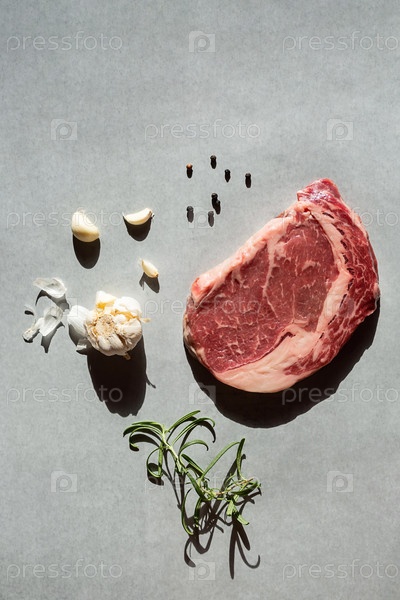 Сырой стейк рибай с розмарином, чесноком и перцем готов к приготовлению