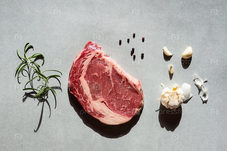 Сырой стейк рибай с розмарином, чесноком и перцем готов к приготовлению