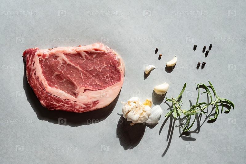 Сырой стейк рибай с розмарином, чесноком и перцем готов к приготовлению