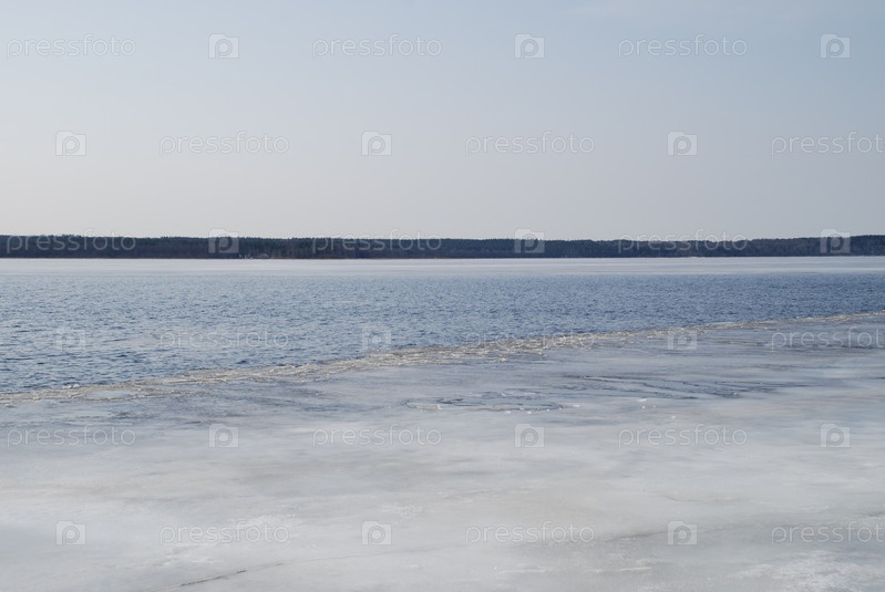 Река освобождается ото льда. Весенний день светло-голубое небо, речной поток с голубой водой. У самого берега небольшая полоса льда, середина реки безо льда. С другой стороны лес