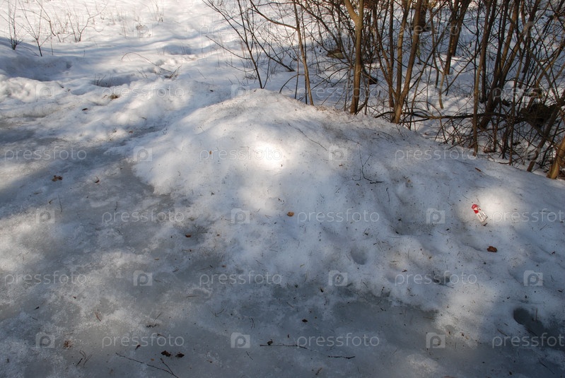 Два разных весенних снега. На земле лежит снег, который начал таять, посередине белый снег, в котором опавшие хвои, вокруг серый снег, пропитанный количеством воды
