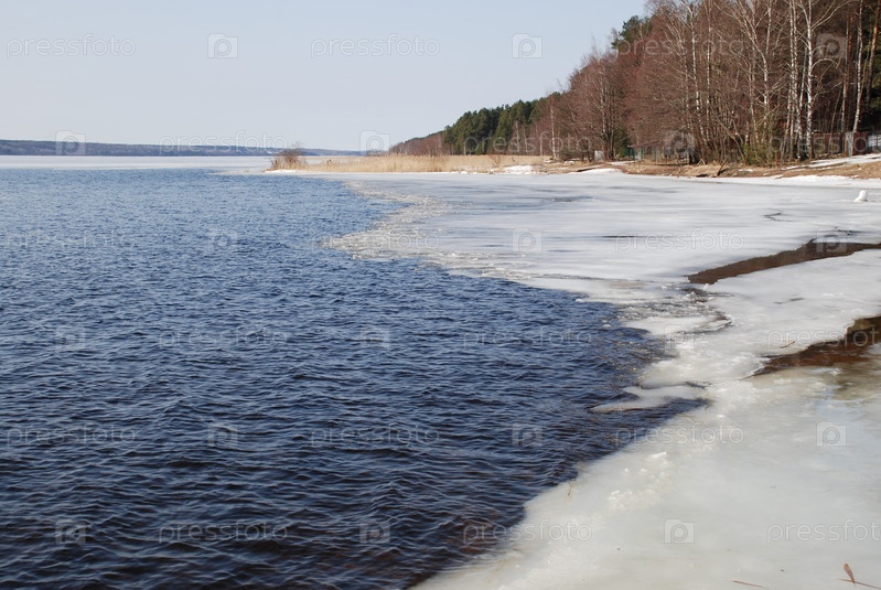 Заснеженный берег реки и лед на краю побережья. Весенний солнечный день, берег реки. Голубое небо и голубая вода, где нет льда. Во льду мокрая сухая озерная трава и камыши. Некоторые деревья