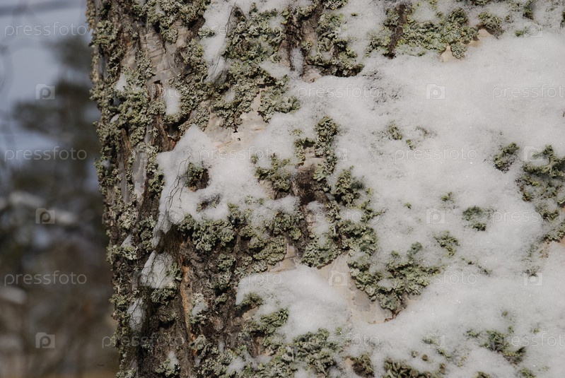Текстура ствола березы покрыта мхом и снегом. План зимнего дня для ствола березы. Ствол белый с черными пятнами, зеленым мхом и белым снегом
