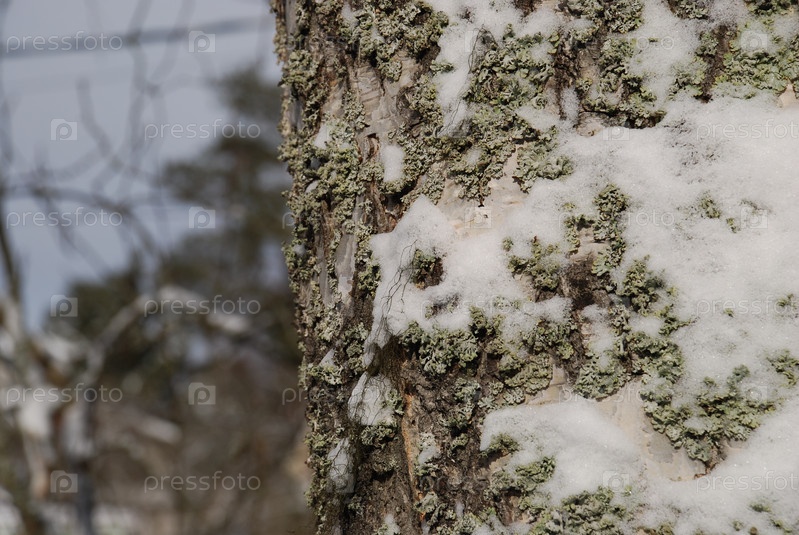 Текстура ствола березы покрыта мхом и снегом. План зимнего дня для ствола березы. Ствол белый с черными пятнами, зеленым мхом и белым снегом. На заднем плане голубое небо