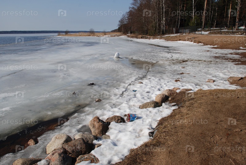 Песчаный берег реки. Весенний солнечный день, берег реки. Голубое небо и голубая вода, где нет льда. На побережье еще лежит снег, но во многих местах снег растаял, обнажив песок и траву