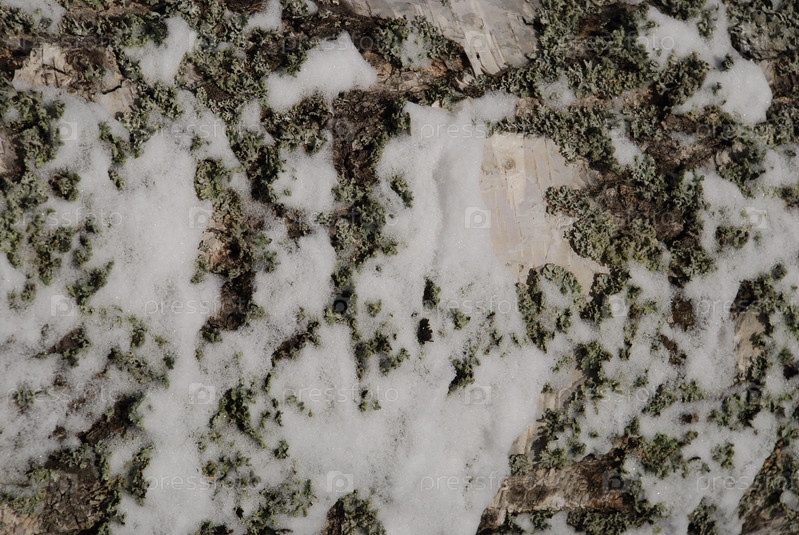 Текстура ствола березы покрыта мхом и снегом. План зимнего дня для ствола березы. Ствол белый с черными пятнами, зеленым мхом и белым снегом