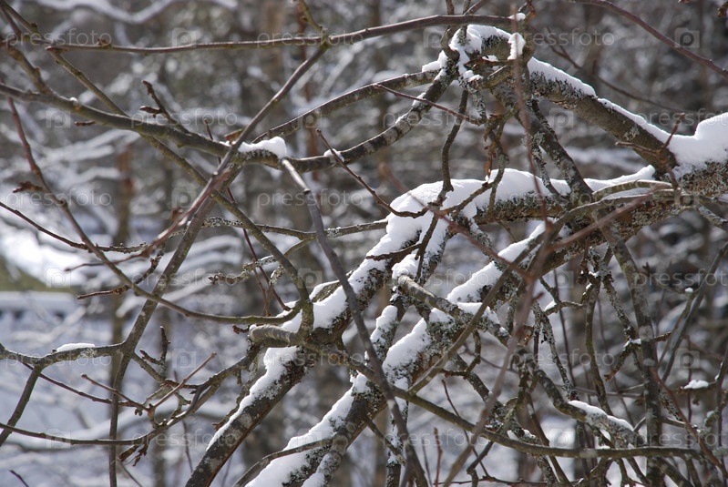 Ветви яблони без листвы и покрытые снегом. Зимняя природа Извилистые толстые и тонкие ветки яблони частично покрыты снегом. Вокруг лежит снег на земле. Вдалеке виднеются серо-коричневые стволы деревьев