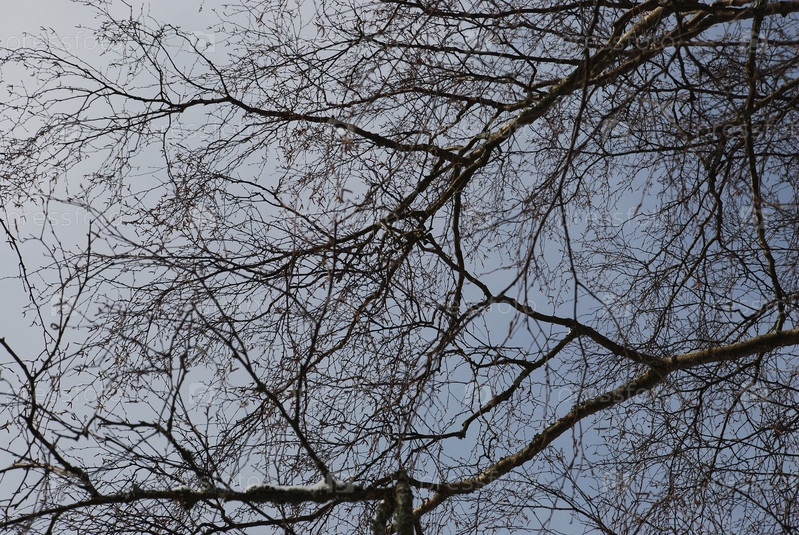 Тонкие извилистые ветки березы без листьев. Зимний день на фоне светло-голубого неба с облаками пересекает множество тонких ветвей березы