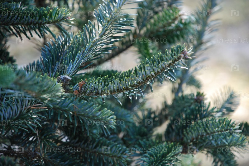 Зеленые пышные ветки молодой елки. Несколько еловых веток, растущих рядом на одном дереве. На ветвях хвоя темно-зеленая. Ветви в середине коричневые. Фон за ветвями размыт