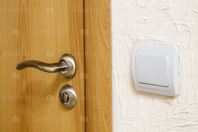 Дверная ручка на деревянной двери у стены с выключателем в помещении крупным планом