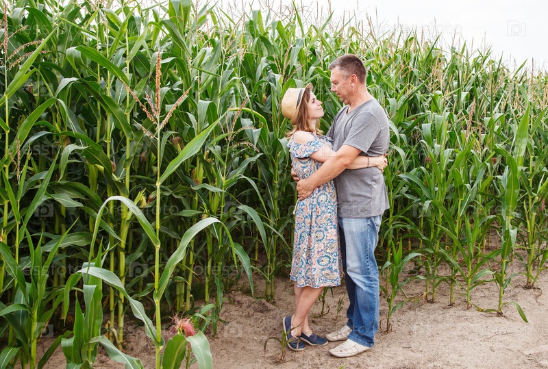 Пара влюбленных балуется на кукурузном поле