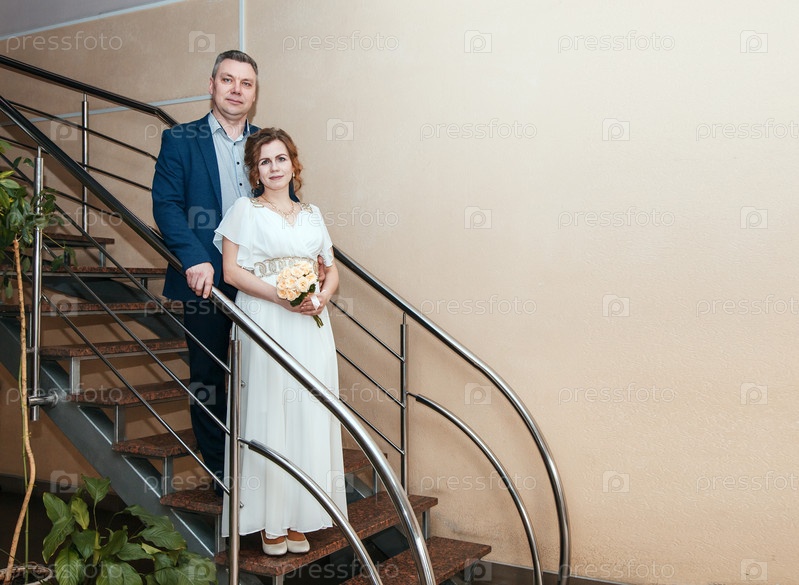 Пара влюбленных, стоящих на лестнице в префектуре на свадьбе