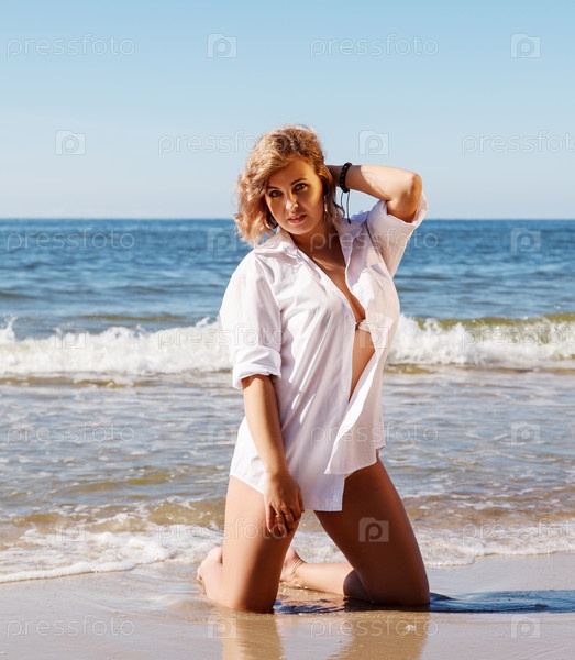 Молодая блондинка в белом купальнике и рубашке позирует на коленях на берегу моря