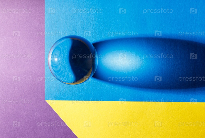 Большой стеклянный шар на цветном столе в помещении крупным планом