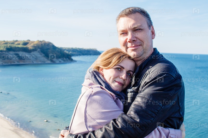 Влюбленная пара обнимается на берегу моря
