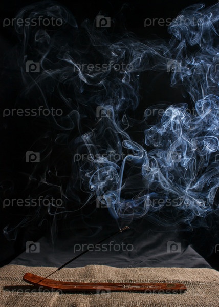 Индийская ароматическая палочка с дымом на черном фоне в помещении крупным планом