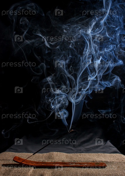 Индийская ароматическая палочка с дымом на черном фоне в помещении крупным планом