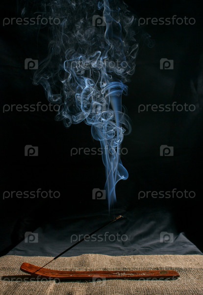 Индийская ароматическая палочка с дымом на черном фоне в помещении крупным планом