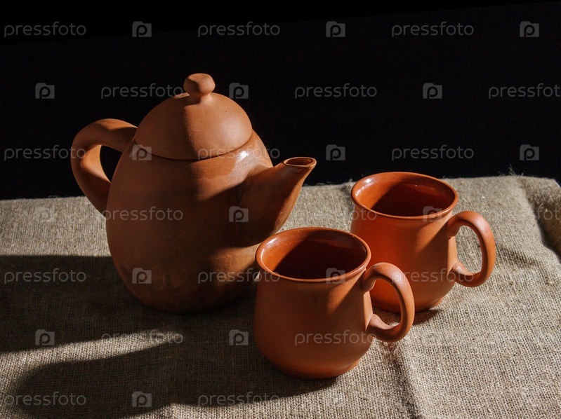 Натюрморт с глиняным чайником и двумя чашками. закрытый крупным планом на черном фоне