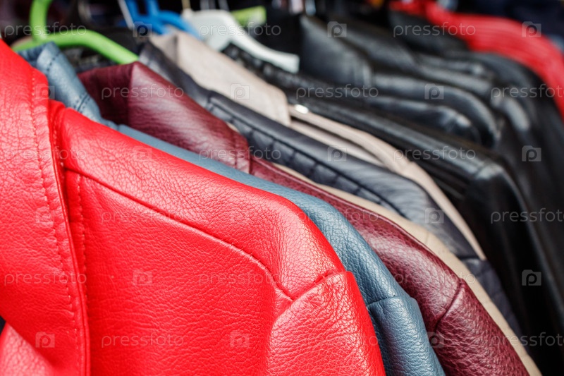Кожаные куртки висят на вешалке на городском рынке