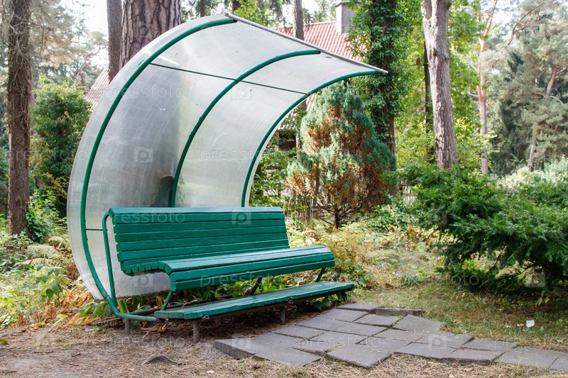 Зеленая деревянная скамейка с навесом в городском парке в летний день