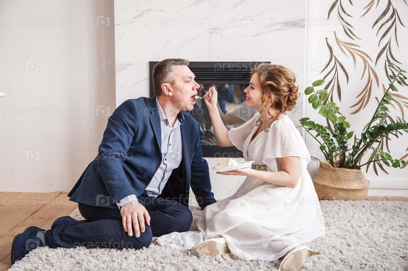 Молодожены. жена кормит мужа тортом
