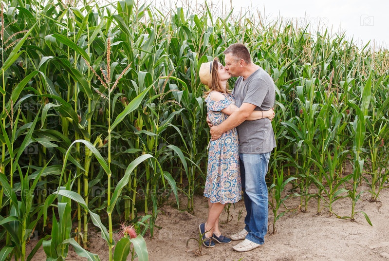 Пара влюбленных целуется на кукурузном поле