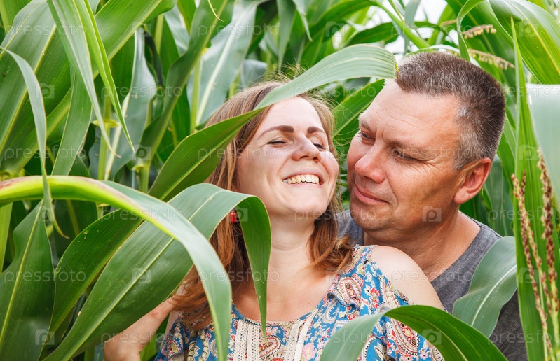 Пара влюбленных ласкается на кукурузном поле
