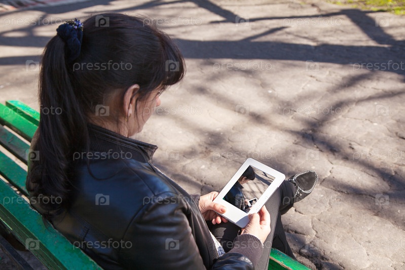 Молодая красивая женщина смотрит на фото на планшете