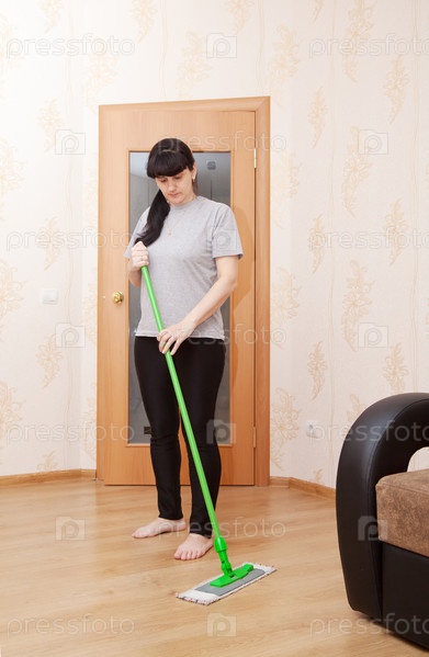 Женщина моет деревянный пол шваброй
