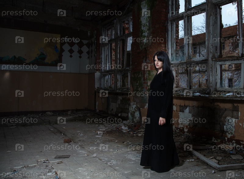 Готическая брюнетка, стоящая в большом пустом зале