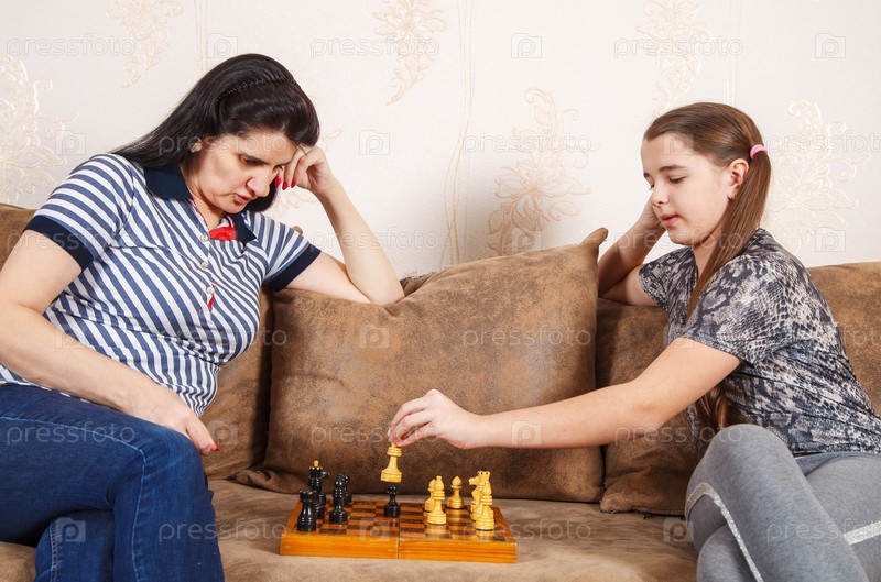 Мама и дочка играют в шахматы дома