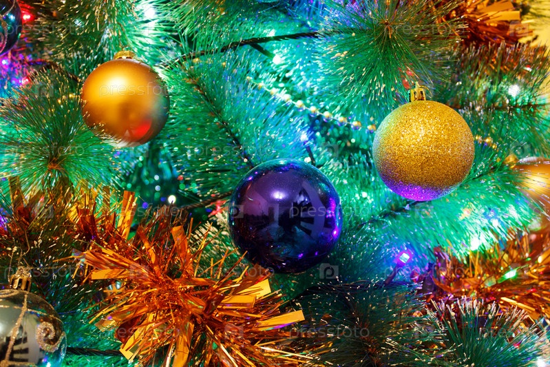 Яркие разноцветные декоративные шары на елке крупным планом в помещении