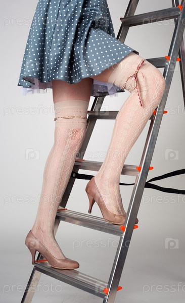 Стройные длинные женские ноги остаются на лестнице в студии