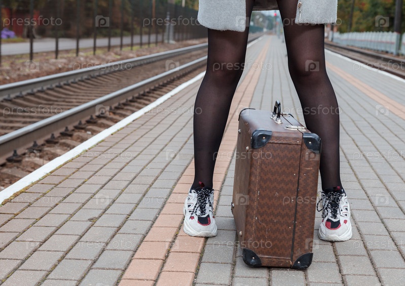 Женщина в сером пальто и с чемоданом стоит на вокзале. ноги крупным планом