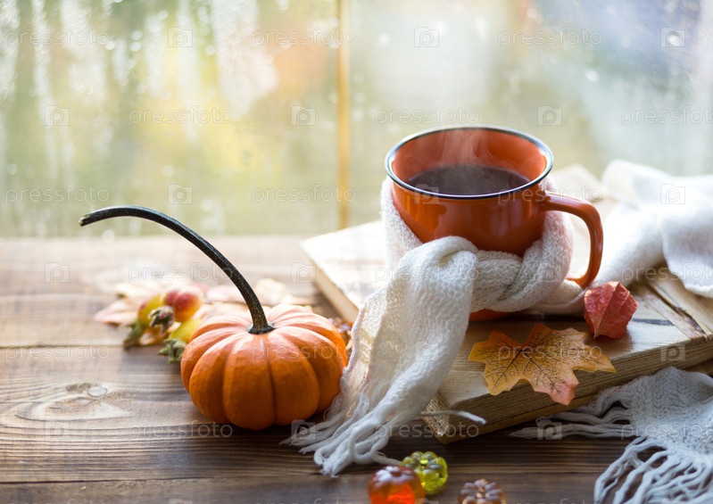 Оранжевая кружка в шарфе с горячим чаем, тыквы, желтые сухие кленовые листья, книга на подоконнике, капли дождя на окне - осеннее настроение