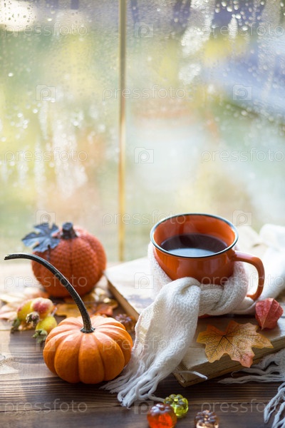 Оранжевая кружка в шарфе с горячим чаем, тыквы, желтые сухие кленовые листья, книга на подоконнике, капли дождя на окне - осеннее настроение