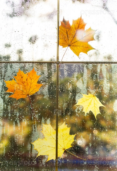 Желтый сухой кленовый лист с каплями дождя прилип к мокрому стеклу окна. Осеннее настроение, прогноз погоды