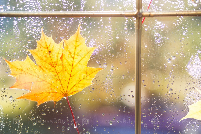 Желтый сухой кленовый лист с каплями дождя прилип к мокрому стеклу окна. Осеннее настроение, прогноз погоды